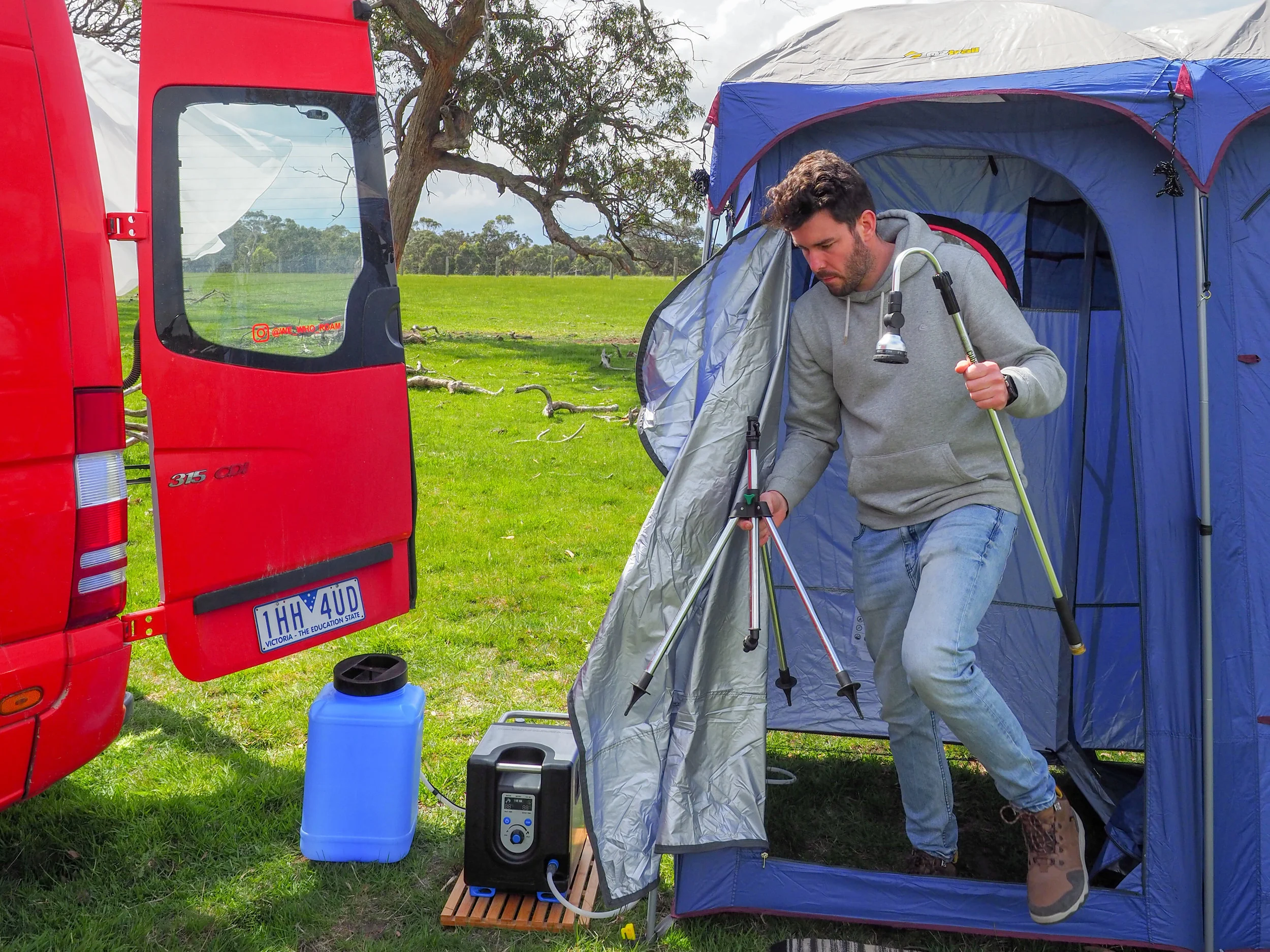 January 2020 UPDATE: The more we travel in our Big Red Home the more we realise that some things just aren’t that useful for us. We’ve actually decided to ditch the portable hot water system and shower tent setup as we just weren’t using them enough to warrant them being hauled all around the country. By getting rid of these bulky items we’ve freed up enough room to upgrade our water tanks to something a bit easier to manage, not that our old system was that bad.